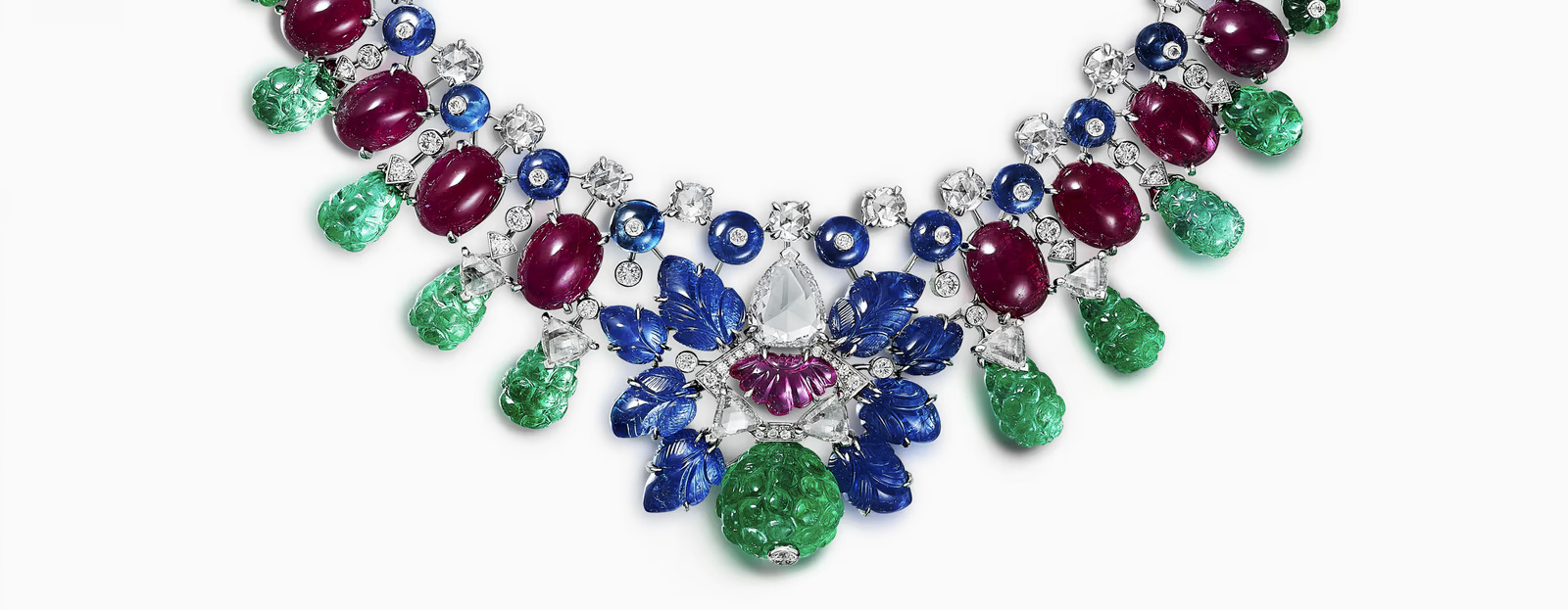 Uma esmeralda zambiana de 18,58 quilates, 3 gotas de esmeralda colombiana gravadas totalizando 130,69 quilates, um rubi birmanês de 23,24 quilates, 8 rubis birmaneses totalizando 46,34 quilates e um pendente de 19 esmeraldas é a fórmula deslumbrante desta criação espetacular, combinando ritmo e harmonia.