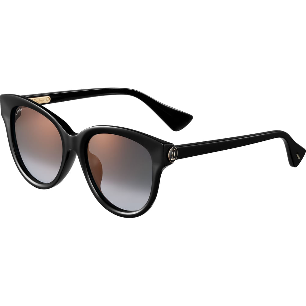Óculos de sol C de Cartier em acetato preto, detalhes em metal com acabamento dourado liso nas hastes, estilo olho de gato e lentes cinzentas com efeito espelhado dourado. Dimensões: Lentes de 55 mm, ponte de 19 mm, hastes de 140 mm