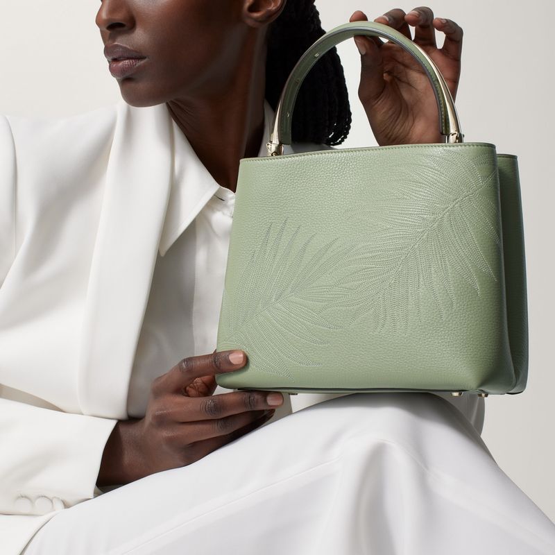Bolsa com alça, modelo pequeno, em couro bovino granulado verde-sálvia e bordado da selva, alça com motivo pantera com acabamento dourado, assinatura "Cartier" dourada com gravação no interior. Um compartimento interior, um bolso plano interior e um bolso removível com fecho de correr em couro bovino granulado tom sobre tom. Fecho magnético numa aba mini em couro. Alça de ombro em couro bovino granulado verde-sálvia removível e ajustável. Quatro suportes em metal de proteção. Forro: couro bovino preto. Dimensões: 240 mm de altura x 190 mm de comprimento x 110 mm de profundidade. Bolsa de mão e de tiracolo.
