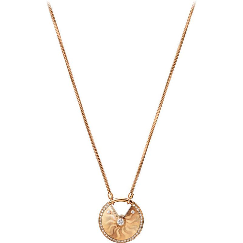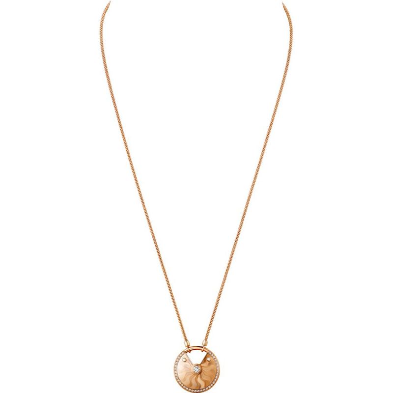 Colar Amulette de Cartier, modelo médio, ouro rosa 18K engastado com 39 diamantes lapidação brilhante totalizando 0,58 ct. Diâmetro do motivo: 25 mm. Corrente: 59 cm. Tamanho 60cm