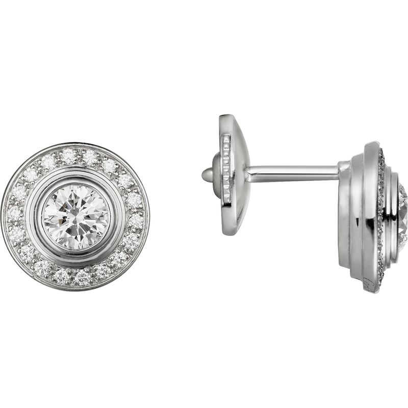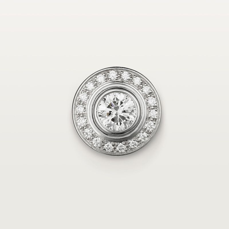 Brincos Cartier d’Amour, ouro branco 750/1000, cada um com diamantes de corte brilhante disponível de 0,18 a 0,29 quilate e 0,50 a 0,59 quilate e com pavé de diamantes de corte brilhante.